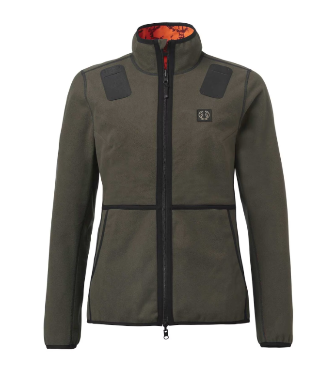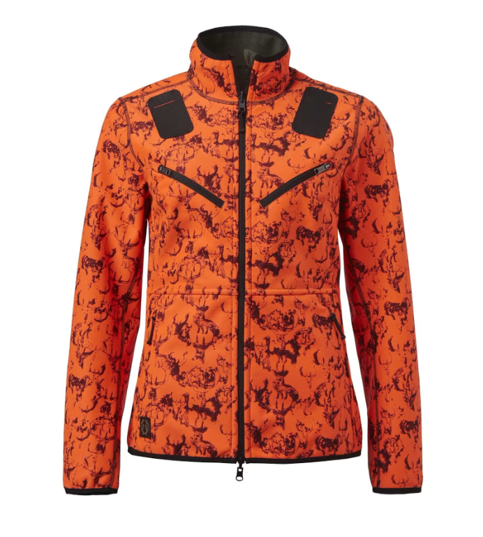 Die wendbare Windjacke ist auf der einen Seite mit dem einzigartigen Hirsch-Muster von Chevalier auf High-Vis-orangem Grund bedruckt und auf der anderen Seite dunkelgrün. Der Stoff ist winddicht, wasserabweisend und atmungsaktiv. Das Material hat einen leichten Stretchanteil, und die Jacke ist ergonomisch geschnitten, mit abgewinkelten Ärmeln für maximale Bewegungsfreiheit. Auf der High-Vis-Seite befinden sich zwei Funkgerättaschen mit Reißverschluss für Rechts- wie Linksschützen, und beide Seiten haben starke, gummierte Funkgeräthalterungen mit Antennenführung. Die High-Vis-Seite verfügt über angenehme Taschen mit Reißverschluss, die grüne Seite über zwei Hängetaschen.