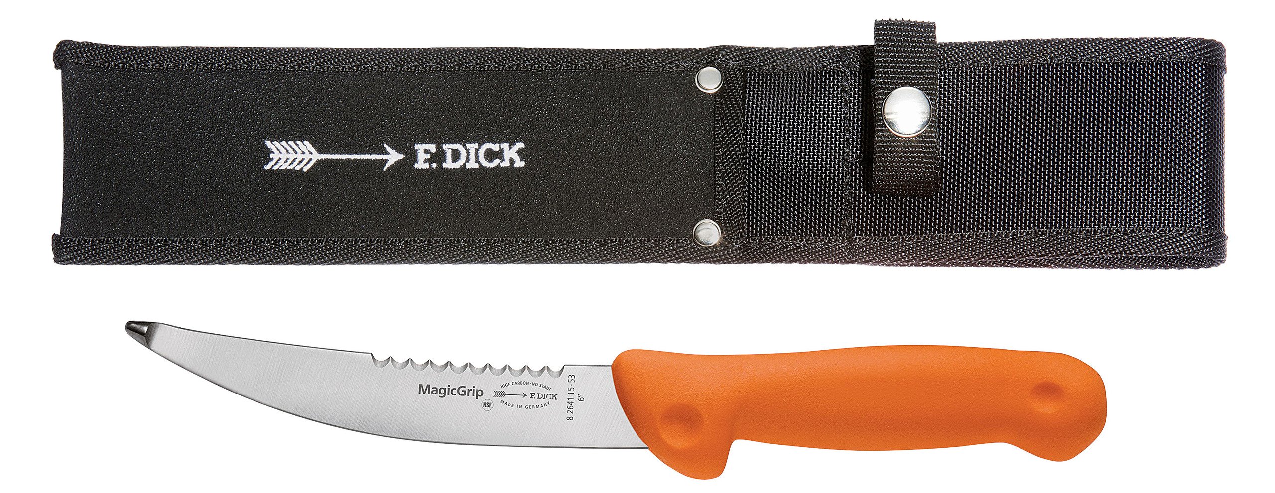 Die Klinge des Magic-Grip-Aufbrechmessers besteht aus rostfreiem Stahl und verfügt über eine Kugelspitze, sodass die Innereien nicht beschädigt werden. Ein rutschsicherer Griff sorgt für gutes Handling, ebenso die Signalfarbe des Messer für gute Erkennbarkeit. Griff und Klinge sind fest miteinander verschweißt. Bei der Lieferung ist die passende Messerscheide miteinbegriffen.