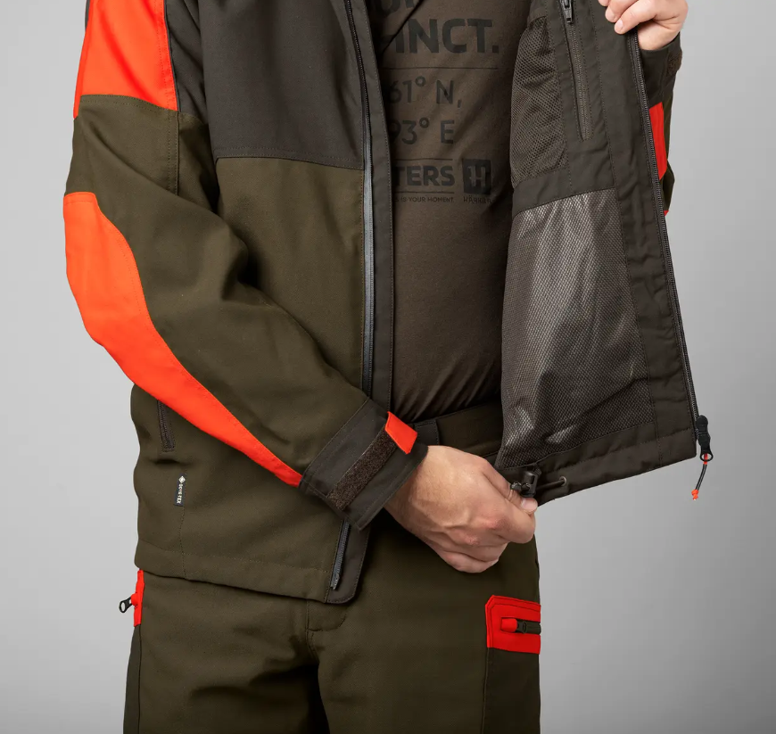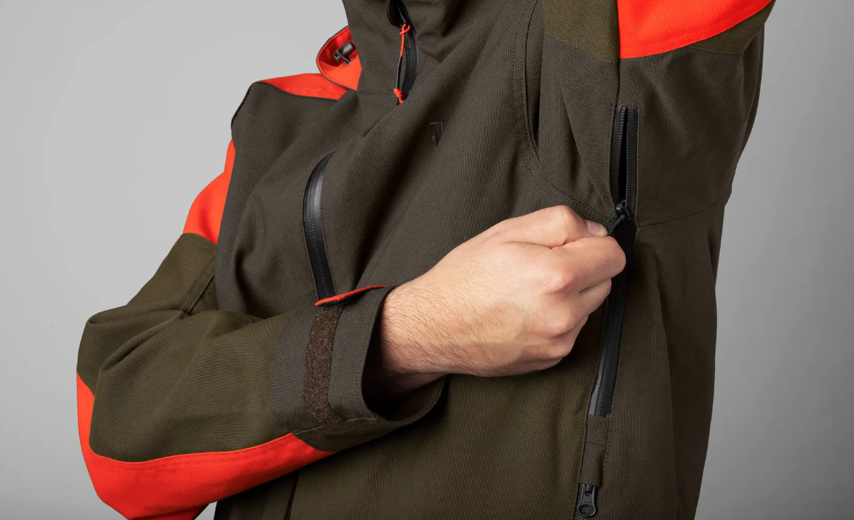 Diese Jacke ist so konzipiert, dass sie der harten Beanspruchung standhält, der Hundehalter auf jeder Drückjagd ausgesetzt sind. Unter den Armen befindet sich eine Belüftung mit wasserdichten Reißverschlüssen. Die Jacke ist am Ärmel, Saumen und Kapuze verstellbar.