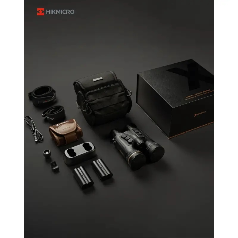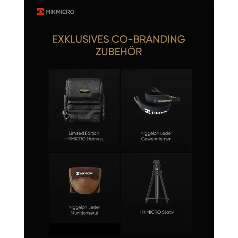 • Schwarze Binocular-Tragetasche (Harness) sowie mit Hikmicro gebrandetes Zubehör (Patronenetui, Gewehrriemen, Kamerastativ)