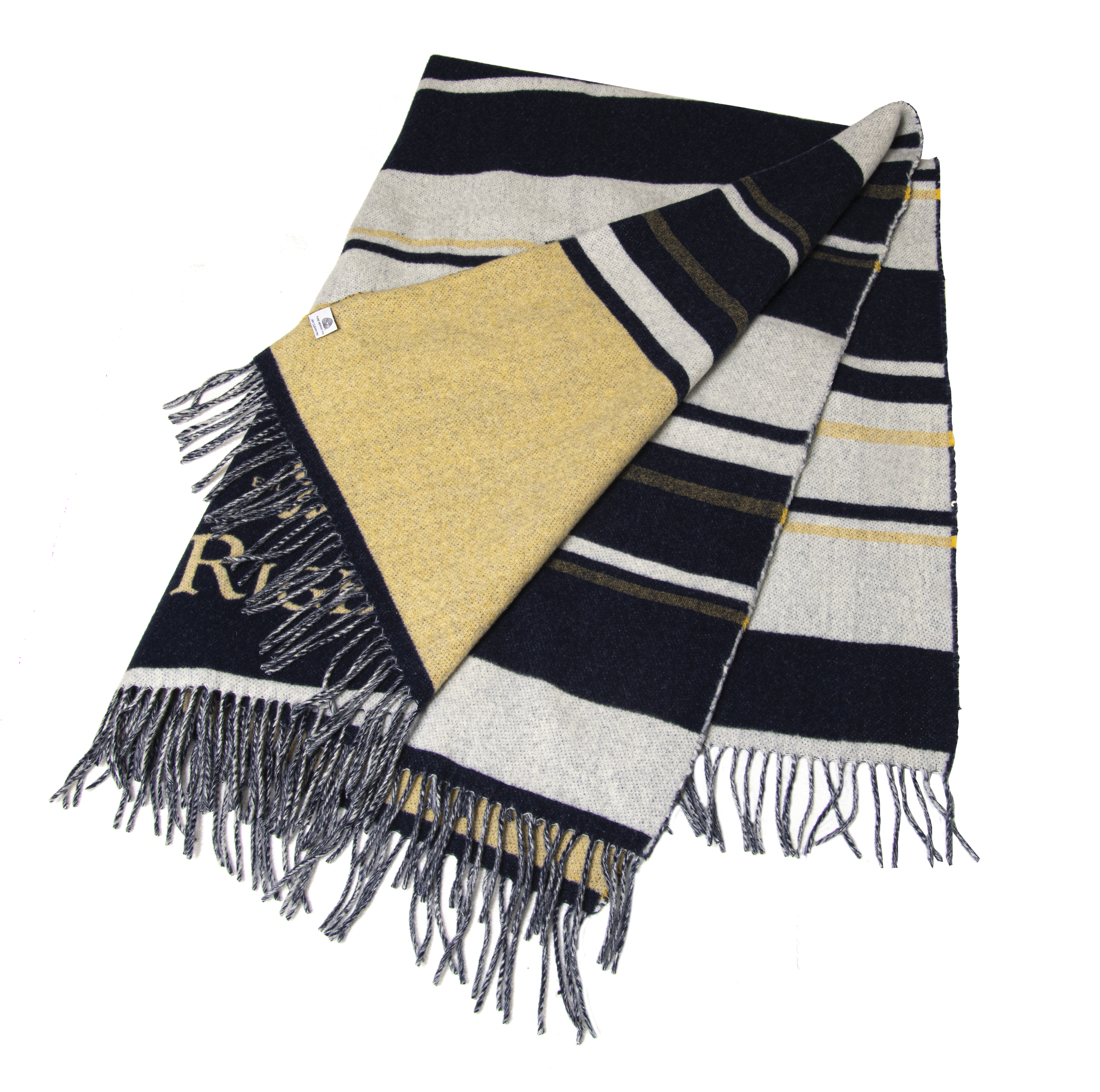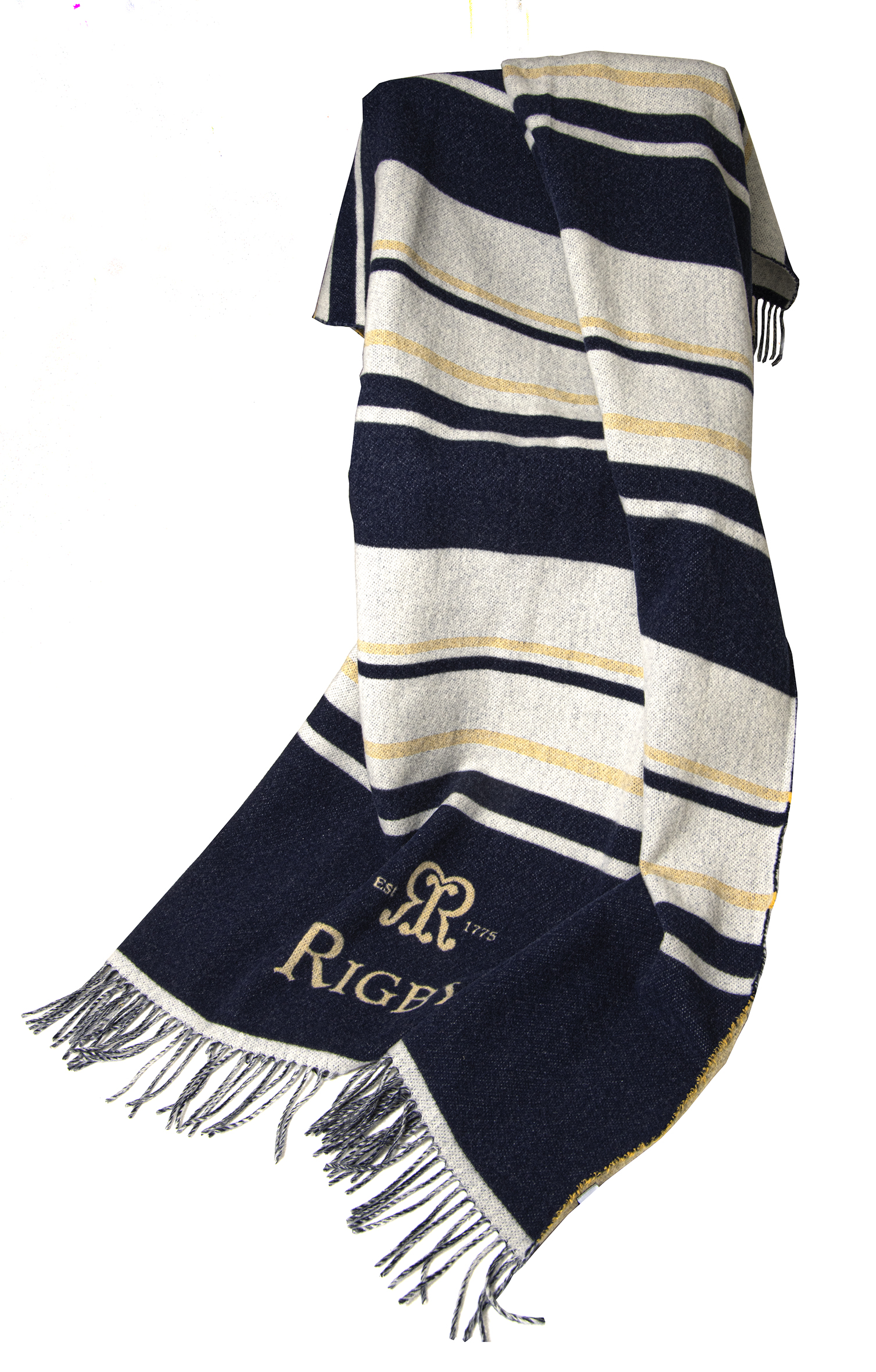 Mit dem stilvollen blau-gold-weiß gestreiften Rigby-Muster und dem goldenen Rigby-Logo ist sie perfekt, um sich am Lagerfeuer oder bei Wanderungen in der Natur warm zu halten. Erhöhen Sie Ihren Komfort und Stil mit dieser hochwertigen Decke, die für den modernen Entdecker entworfen wurde.