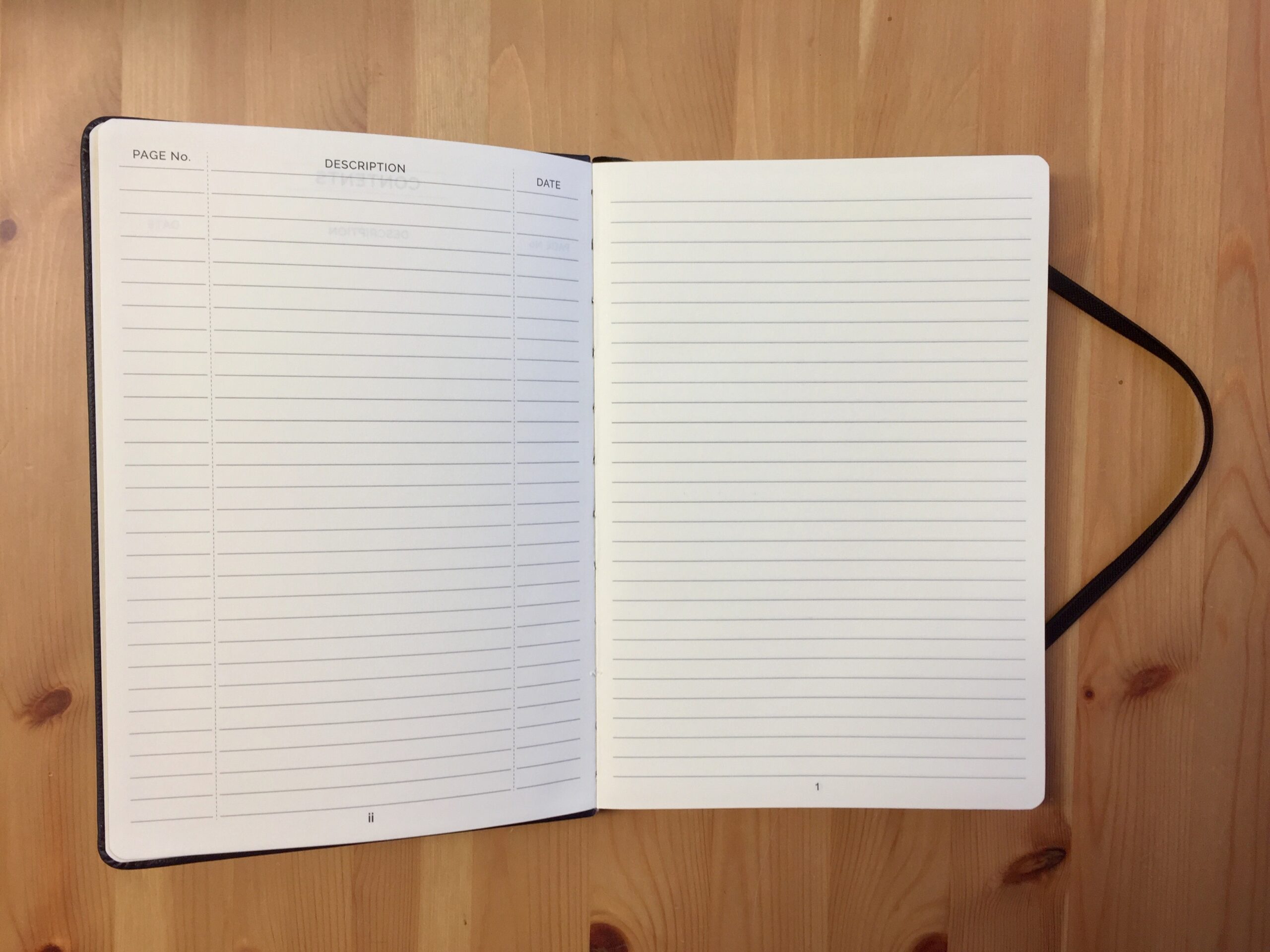 Gebundenes Notizbuch mit dem in Gold geprägten Rigby-Siegel-Logo, inklusive Dokumententasche und Geheimpolster.