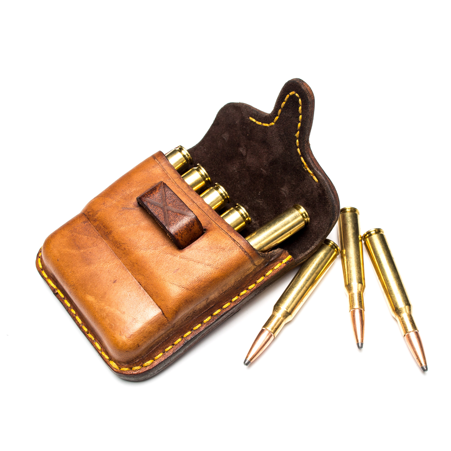 Dieses robuste Leder-Etui für Büchsenpatronen hat unter Kennern bereits Kult-Status. Das exquisite Patronen-Etui wird für Rigby in Südafrika von Hand gefertigt und hält ein Leben lang. Es lässt sich dank einer Lasche auf der Rückseite am Gürtel befestigen und tragen, ist mit dem Rigby-Logo „Double R“ geprägt und bietet Platz für fünf Büchsen-Patronen in europäischen Großkalibern von ca. 6 bis 8 mm Durchmesser. Wie für 7×57, 8×57, 9,3×62, 308 Win. .30-06 und ähnliche.