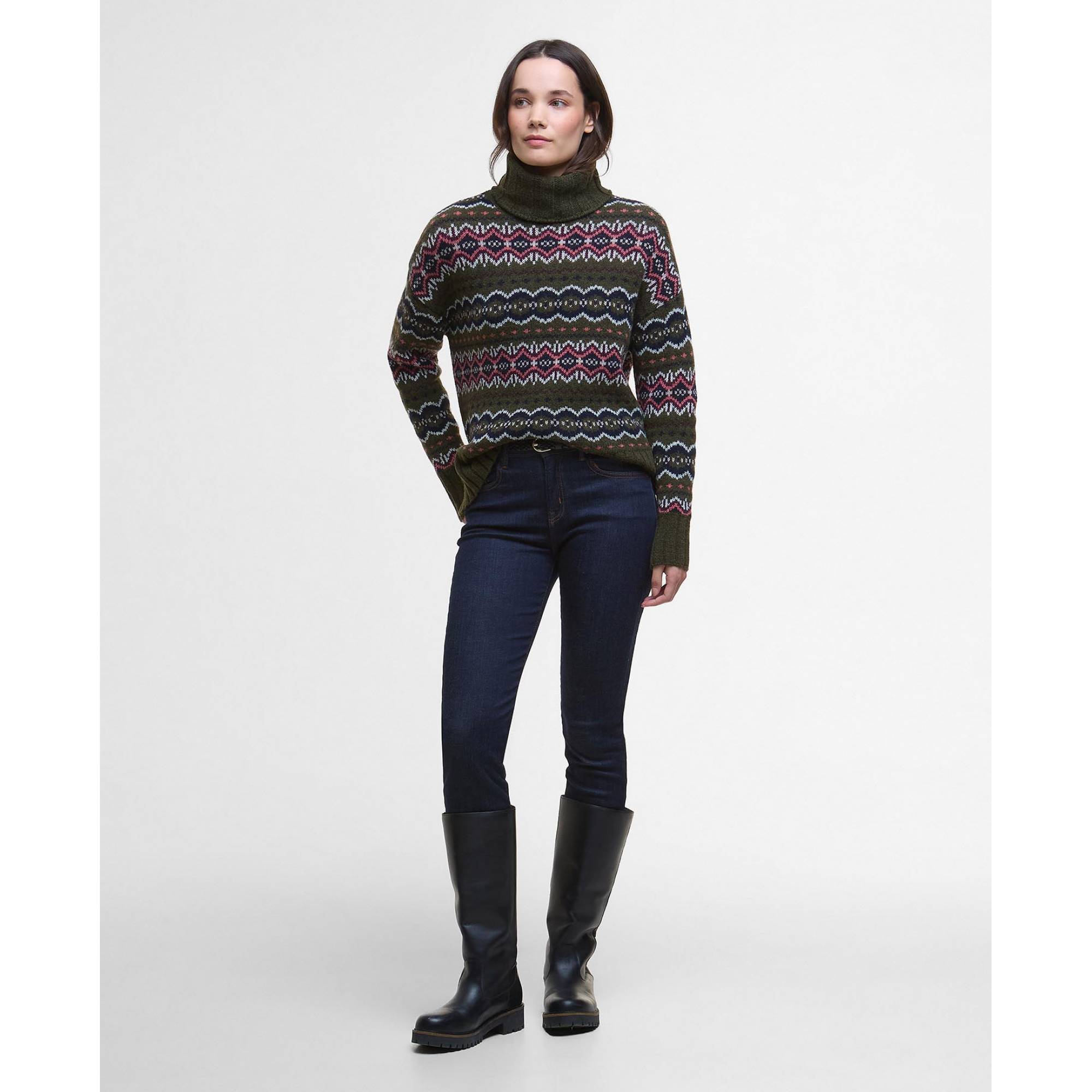 Ein Strickpullover mit Fair Isle-Muster ist ein echter Klassiker. Der Barbour Rollkragenpullover Helen setzt ein ausdrucksstarkes Statement. Das Design aus einem Wollmix präsentiert sich mit einem besonders weichen Oversized-Rollkragen und passt zu Alltagsoutfits mit Jeans und Sneakers.