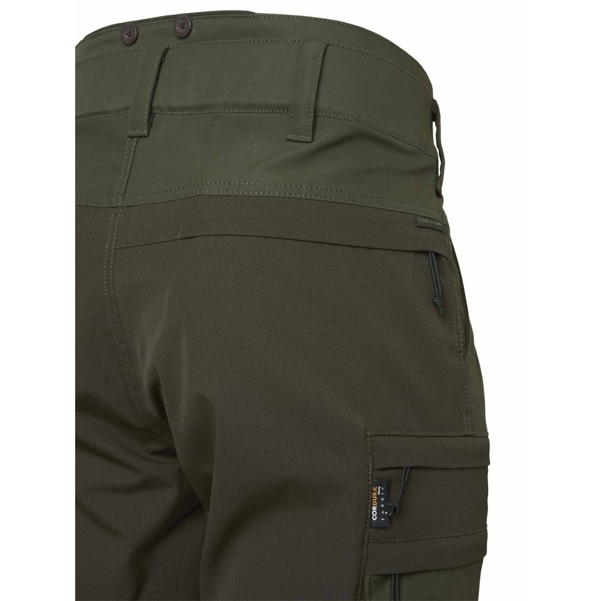 Cross Hybrid Pants ist eine sehr funktionale, vielseitig tragbare Jagdhose aus zwei verschiedenen Stoffen. Der Stretchstoff aus Polyester macht die Hose geschmeidig und flexibel, während die Verstärkungen aus Ripstop Cordura® an Gesäß und Knien für Strapazierfähigkeit und Langlebigkeit sorgen. Das Ripstop-Cordura-Gewebe ist innen mit einer Membran ausgestattet, wodurch die Hose zu einem gewissen Grad wasserdicht ist: Der Membranstoff hat eine weich gebürstete Innenseite, sodass sich die Hose angenehm auf der Haut anfühlt. Sie hat Ösen und Knöpfe zum Befestigen von Hosenträgern sowie zwei Vordertaschen, eine Gesäßtasche und zwei mit Reißverschlüssen versehene Beintaschen. Cross Hybrid Pants hat ergonomisch abgewinkelte Beine und Zweiwege-Belüftungsreißverschlüsse an den Seiten von den Knien abwärts. Auf der Innenseite der Hosenbeine unten befinden sich Haken zum Befestigen an den Stiefeln, damit die Hose bei der Bewegung nicht nach oben rutscht.