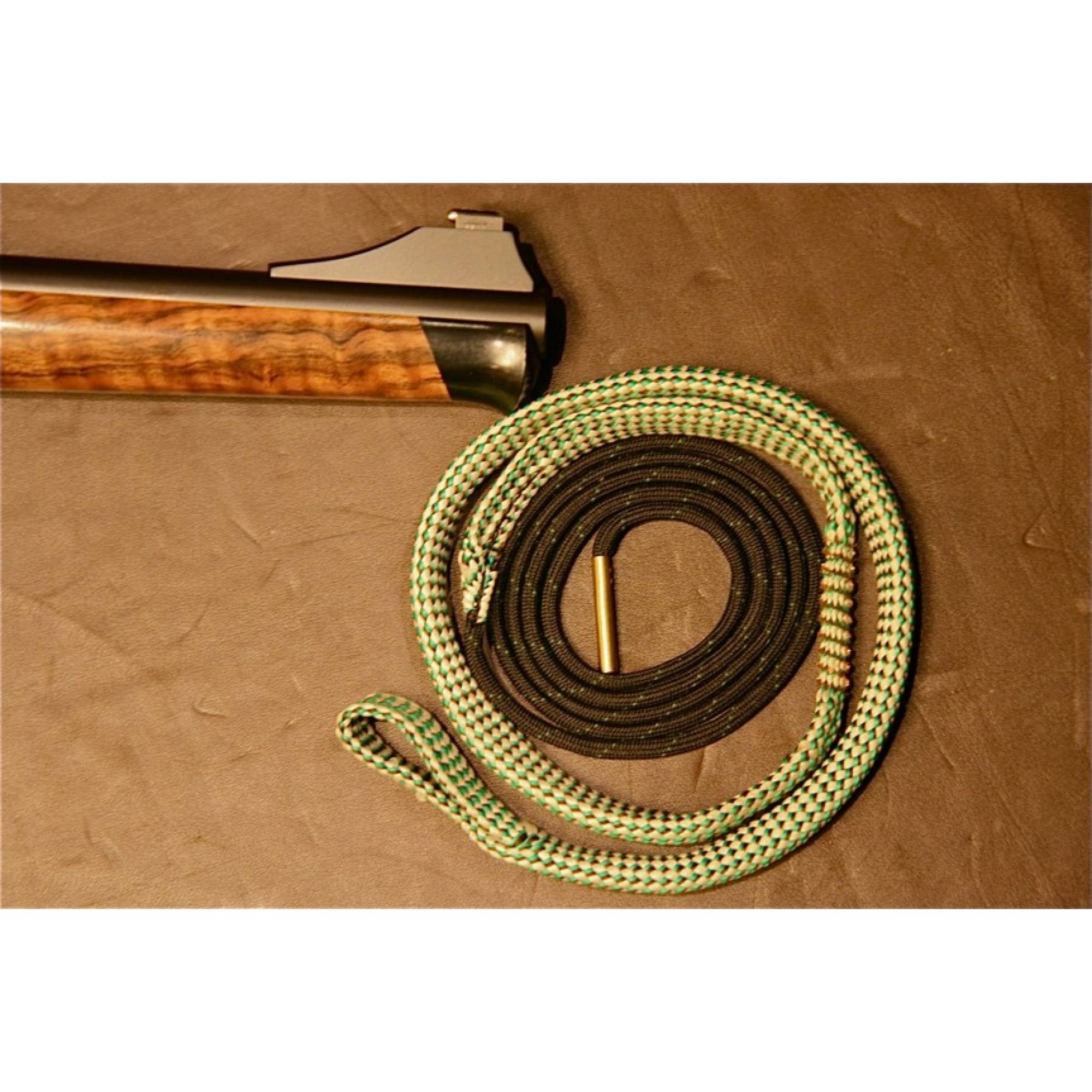 Es handelt sich dabei um eine Cordel bzw. ein Gewebeband, in dessen Endstück je nach Kaliber ein bzw. zwei Bronzebürsten eingearbeitet sind. Am vorderen Ende befindet sich ein kleines Messinggewicht, in welches praktischerweise auch das Kaliber der jeweiligen Bore Snake eingeprägt ist, so dass Verwechslungen im Kaliber bei den unterschiedlichen Bore Snakes ausgeschlossen sind.